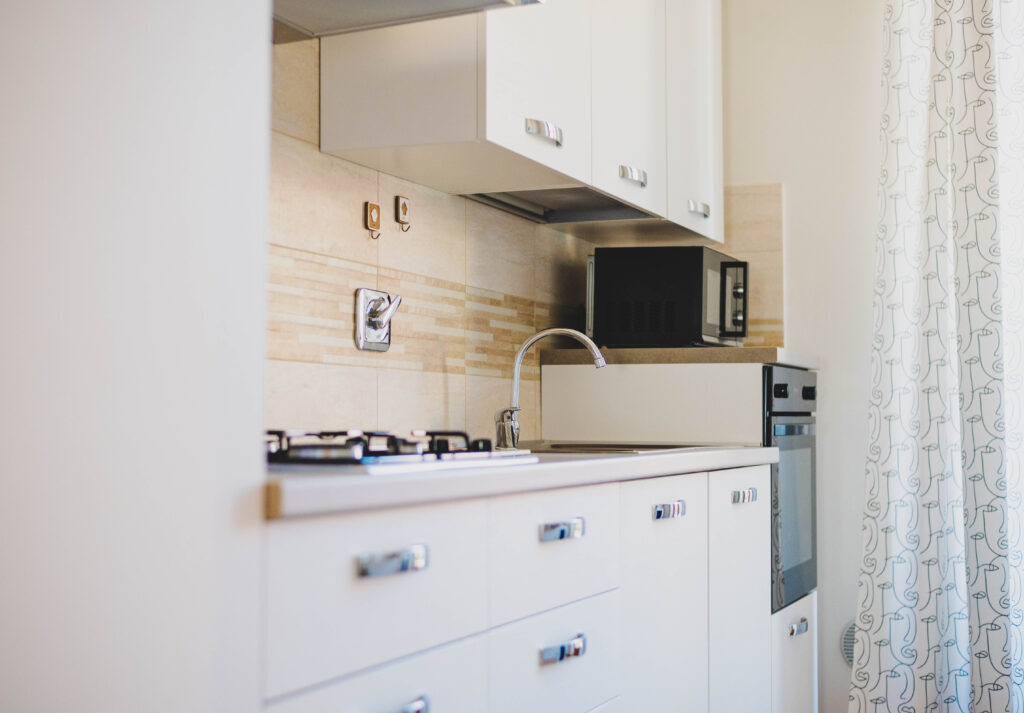 Forno, microonde, bollitore, macchina del caffè, fornelli a gas, stoviglie e posate. Tutto ciò che ti serve se vuoi fare un soggiorno lungo e non dipendere dai ristoranti o dal delivery.